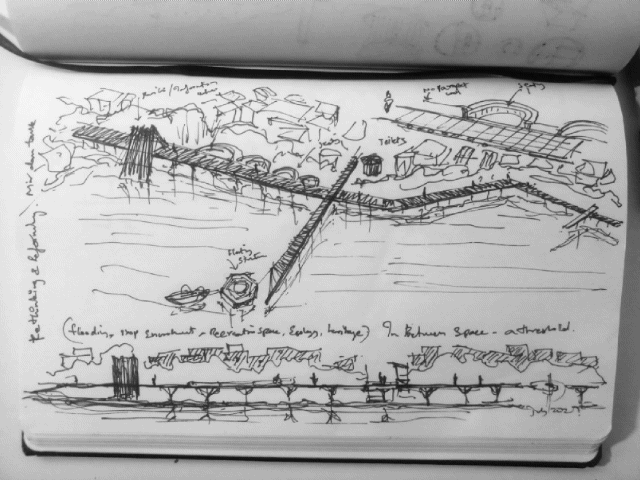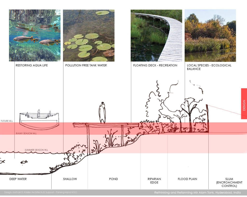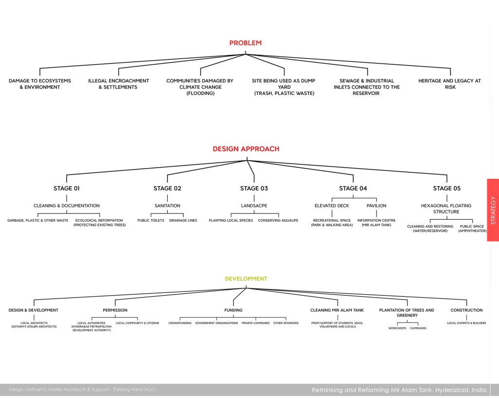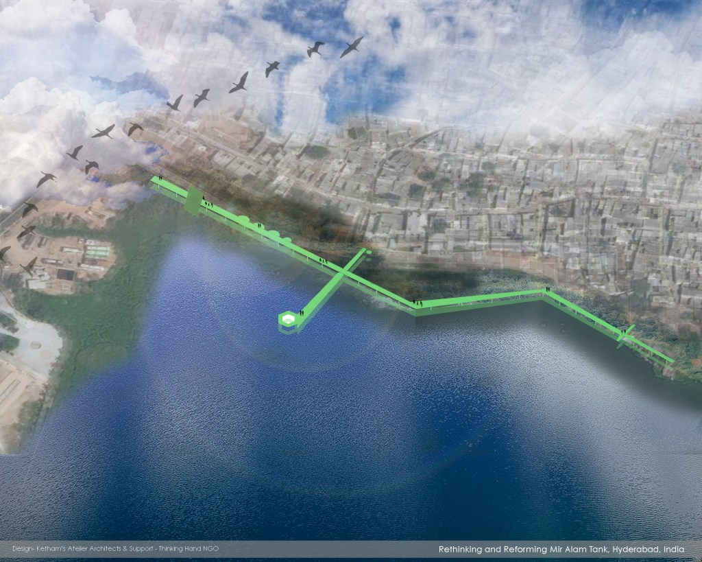 A self-initiated research project with the collective approach instigated towards rethinking and reforming the historic heritage site of Mir Alam Tank in Hyderabad, India. A design approach that addresses unlawful encroachment, land reclamation, flooding, Industrial pollution and environment damage of Mir Alam Tank. The aim and objective of the research project is to protect and restore the ecosystem and preserve the history by providing recreational spaces, sanitation & an innovative solution for cleaning water.